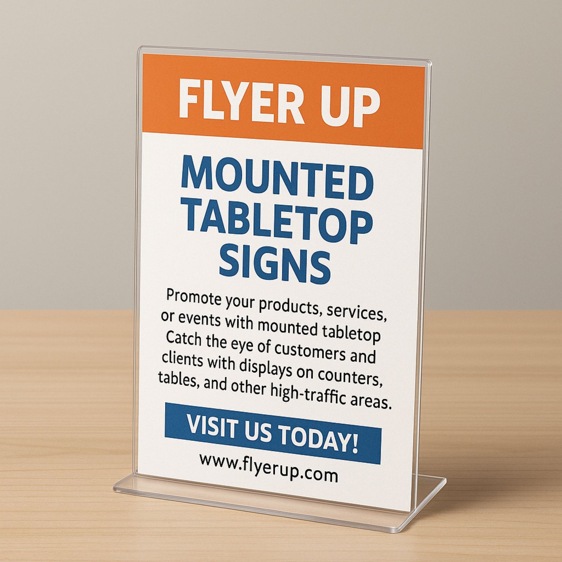 Bring style and clarity to any table or counter with our Mounted Tabletop Signs. Printed in full color and mounted on durable board, these signs are perfect for menus, promotions, or event displays. Sleek, sturdy, and customizable — they make every message stand out beautifully.